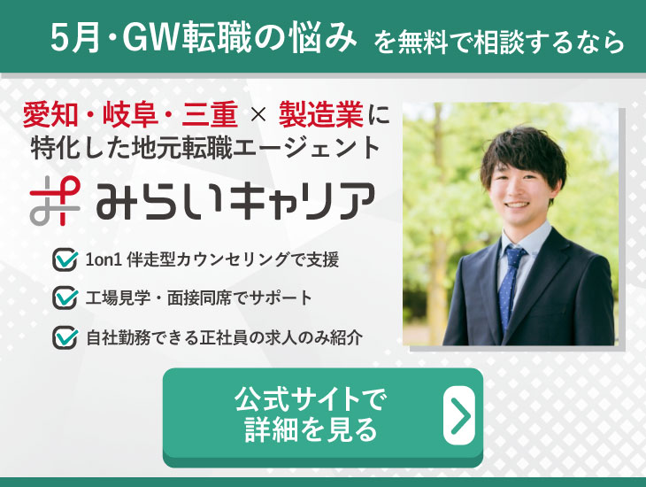 この記事では、5月・GWに転職活動を進めるメリットや注意点、具体的な進め方までをわかりやすく解説します。さらに、東海エリア(愛知・岐阜・三重)で製造業・メーカー転職を目指す方に向けて、現場目線のリアルなポイントもお伝えします。